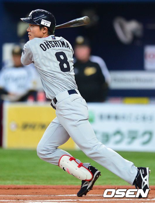 6회초 주니치 공격 1사 주자 없는 상황 1번타자 오시마 요헤이가 중전안타를 날리고 있다.