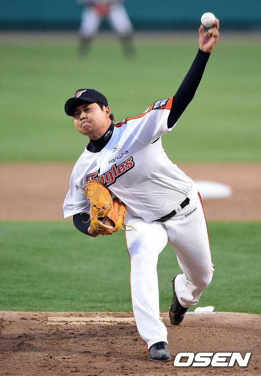 1회초 무사에서 한화 선발투수 유창식이 힘차게 공을 던지고 있다.