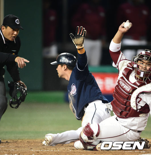 1일 목동야구장에서 벌어진 '2014 한국야쿠르트 세븐 프로야구' 넥센 히어로즈와 두산 베어스의 경기 3회초 1사 1,3루 홍성흔의 내야땅볼때 3루주자 오재원이 홈에서 아웃 되고 있다.