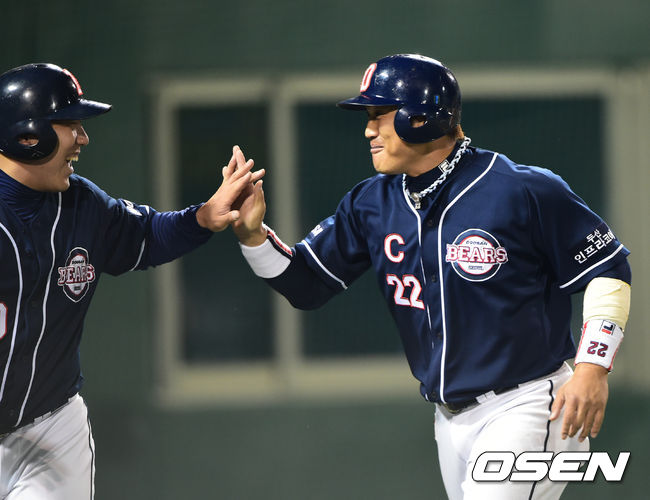 1일 목동야구장에서 벌어진 '2014 한국야쿠르트 세븐 프로야구' 넥센 히어로즈와 두산 베어스의 경기 3회초 2사 만루 양의지의 쉬운 타구를 넥센 좌익수 로티노가 놓친 사이 홈을 밟은 김현수와 홍성흔이 환하게 웃고 있다.