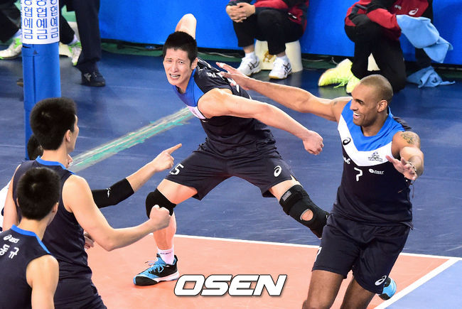 1일 오후 충남 천안시 천안유관순체육관서 열린 NH농협 2013~2014 V-리그 남자부 챔피언결정전 3차전 현대캐피탈과 삼성화재의 경기, 1세트 현대캐피탈 문성민이 득점 성공 시킨후 환호하고 있다