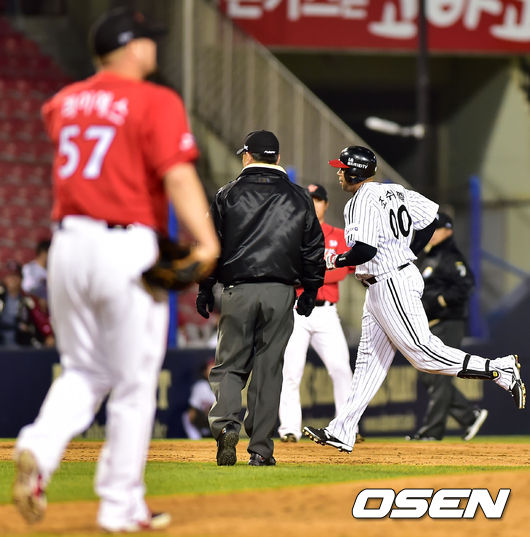 1일 오후 잠실구장서 열린 '2014 한국야쿠르트 세븐 프로야구' LG 트윈스와 SK 와이번스의 홈 개막전, 3회말 1사 주자 2루 LG 조쉬 벨이 좌월 투런 홈런을 날린 후 그라운드를 돌고 있다.