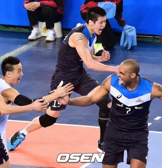 1일 오후 충남 천안시 천안유관순체육관서 열린 NH농협 2013~2014 V-리그 남자부 챔피언결정전 3차전 현대캐피탈과 삼성화재의 경기, 1세트 현대캐피탈 문성민이 득점 성공 시킨후 환호하고 있다