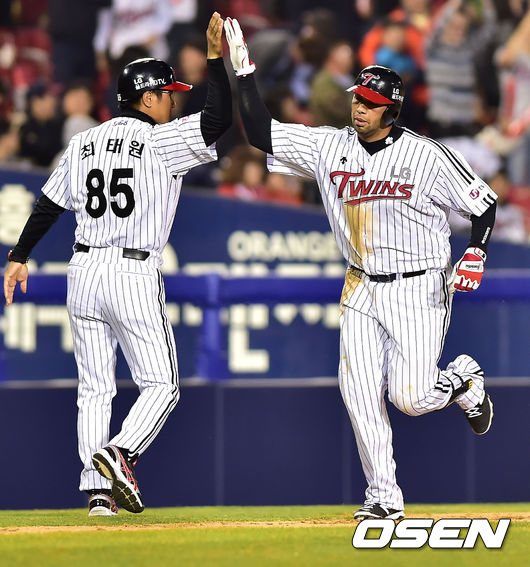1일 오후 잠실구장서 열린 '2014 한국야쿠르트 세븐 프로야구' LG 트윈스와 SK 와이번스의 홈 개막전, 3회말 1사 주자 2루 LG 조쉬 벨이 좌월 투런 홈런을 날린 후 그라운드를 돌고 있다.