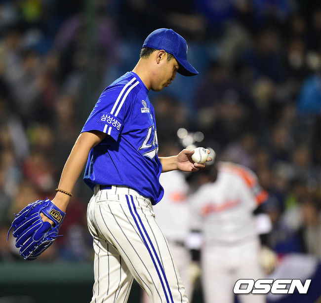 2회말 2사 1,3루에서 삼성 장원삼이 한화 정근우에 볼넷을 허용하며 아쉬워하고 있다.
