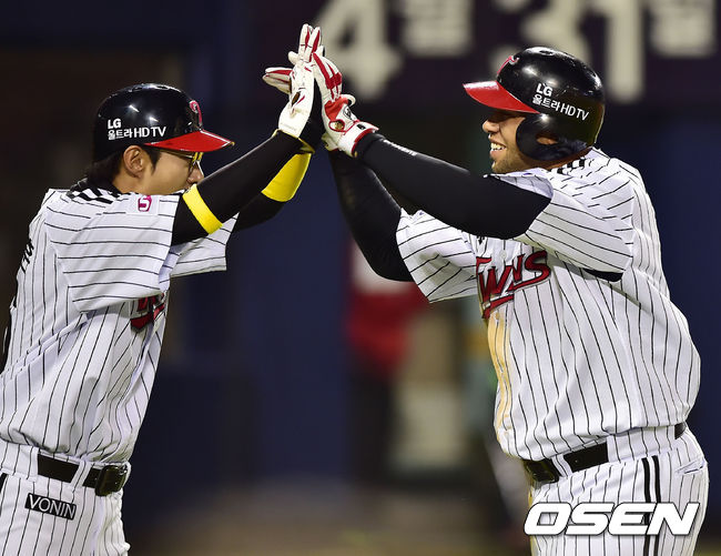 1일 오후 잠실구장서 열린 '2014 한국야쿠르트 세븐 프로야구' LG 트윈스와 SK 와이번스의 홈 개막전, 3회말 1사 주자 2루 LG 조쉬 벨이 좌월 투런 홈런을 날린 후 홈에서 정성훈과 하이파이브를 하고 있다.