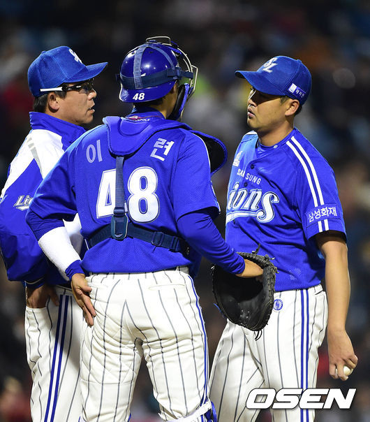 2회말 2사 만루에서 삼성 장원삼이 마운드에 오른 김태한 투수코치와 이야기를 나누고 있다.
