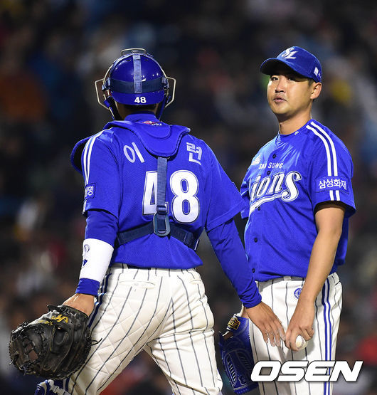 2회말 2사 만루에서 삼성 장원삼이 마운드에 오른 포수 이흥련과 이야기를 나누고 있다.