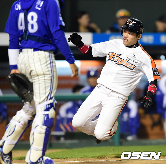 2회말 2사 만루에서 한화 피에의 2타점 적시타 때 2루주자 이용규가 홈을 밟고 있다.