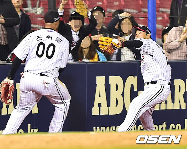 1일 오후 잠실구장서 열린 '2014 한국야쿠르트 세븐 프로야구' LG 트윈스와 SK 와이번스의 홈 개막전, 4회말 1사 주자 없는 상황에서 SK 조동화의 타구를 LG 좌익수 정의윤이 관중석까지 달려와 잡아내고 있다.