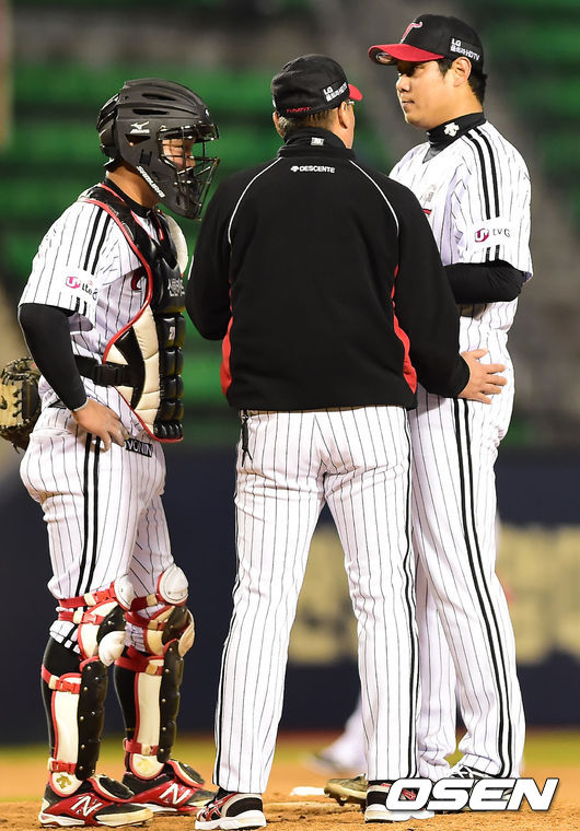 1일 오후 잠실구장서 열린 '2014 한국야쿠르트 세븐 프로야구' LG 트윈스와 SK 와이번스의 홈 개막전, 3회초 무사 주자 2,3루 SK 나주환 타석때 LG 김기태 감독이 마운드에 올라 LG 류제국을 격려하고 있다.