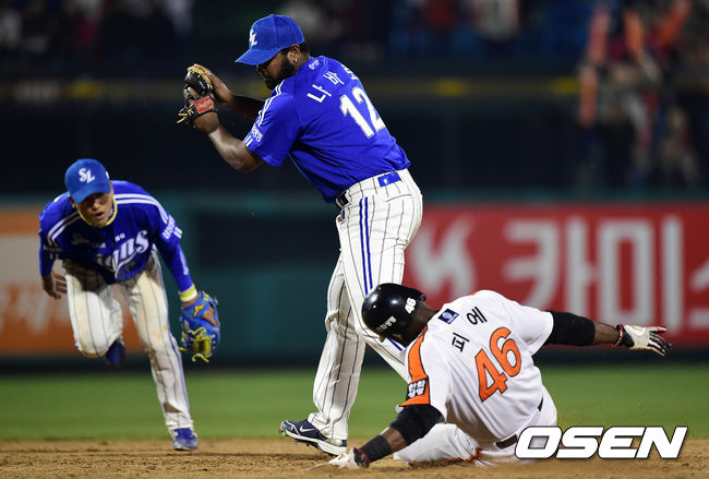2회말 2사 1,2루에서 한화 김태균의 내야땅볼때 삼성 나바로가 1루주자 피에를 포스아웃 처리하고 있다.