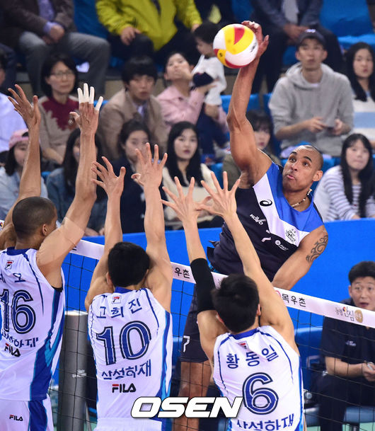 1일 오후 충남 천안시 천안유관순체육관서 열린 NH농협 2013~2014 V-리그 남자부 챔피언결정전 3차전 현대캐피탈과 삼성화재의 경기, 1세트 현대캐피탈 아가메즈가 강타를 날리고 있다