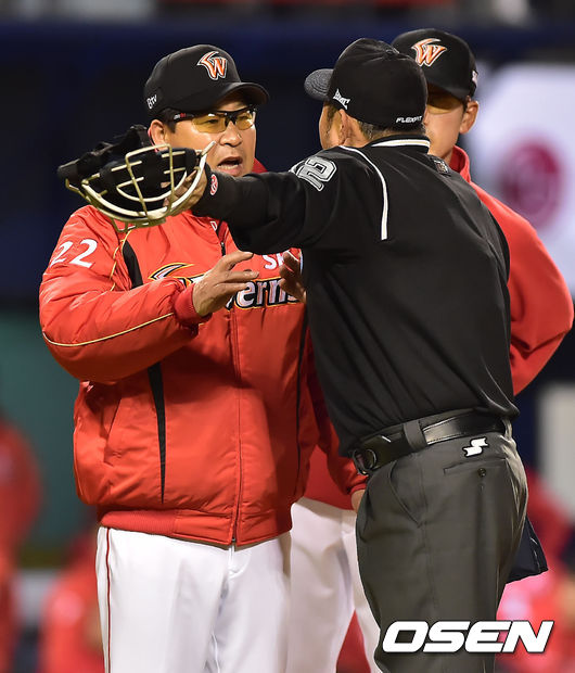 1일 오후 잠실구장서 열린 '2014 한국야쿠르트 세븐 프로야구' LG 트윈스와 SK 와이번스의 홈 개막전, 3회초 1사 2루 SK 조인성의 포수 파울플라이 아웃때 이만수 감독이 그라운드로 나와 이영재 주심에게 이야기를 하고 있다.