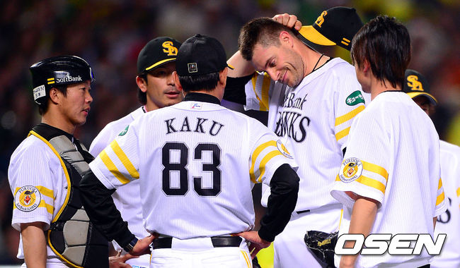 7회초 1사 2루 소프트뱅크 제이슨 스탠드릿지가 니혼햄 요 다이칸에게 2타점 적시타를 허용한 뒤 교체되고 있다.