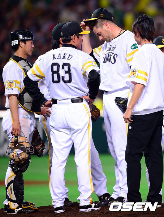 7회초 1사 2루 소프트뱅크 제이슨 스탠드릿지가 니혼햄 요 다이칸에게 2타점 적시타를 허용한 뒤 교체되고 있다.