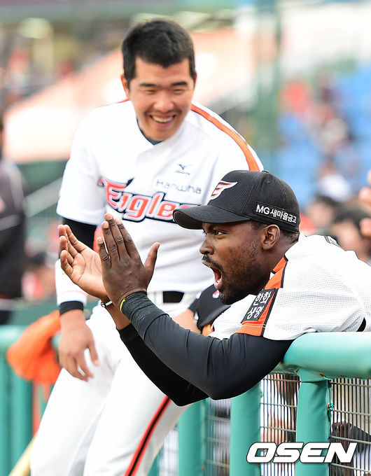 경기에 앞서 열린 개막식 행사에서 한화 피에가 축하공연을 보고 환호하자 정근우가 바라보며 환하게 웃고 있다.