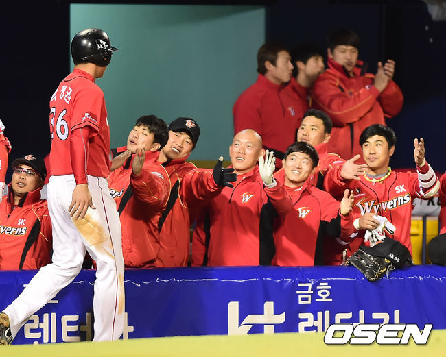 1일 오후 잠실구장서 열린 '2014 한국야쿠르트 세븐 프로야구' LG 트윈스와 SK 와이번스의 홈 개막전, 3회초 무사 주자 2,3루 SK 나주환의 중견수 희생플라이때 홈을 밟은 박정권이 덕아웃에서 동료들과 하이파이브를 하고 있다.