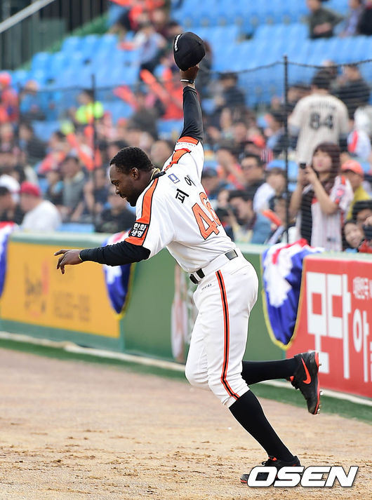 경기에 앞서 열린 개막식 행사에서 한화 피에가 홈팬들에게 인사를 하며 그라운드로 나가고 있다.