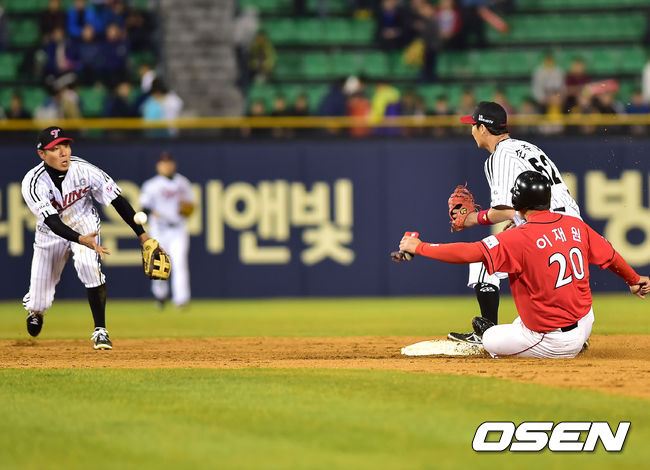 1일 오후 잠실구장서 열린 '2014 한국야쿠르트 세븐 프로야구' LG 트윈스와 SK 와이번스의 홈 개막전, 5회초 2사 주자 1,2루 SK 조인성의 땅볼 타구때 LG 유격수 권용관의 실책으로 이재원이 2루에 세이프되고 있다.