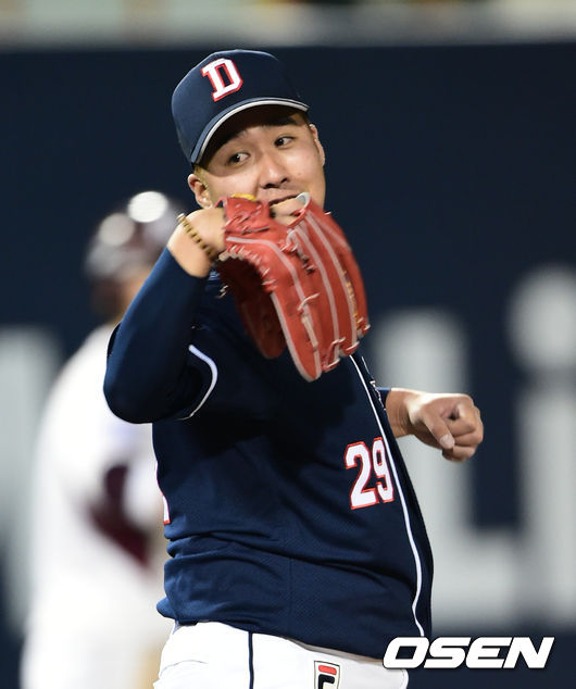 1일 목동야구장에서 벌어진 '2014 한국야쿠르트 세븐 프로야구' 넥센 히어로즈와 두산 베어스의 경기 5회말 유희관이 3회말에 이어 박병호 강정호를 연속 삼진으로 돌려세운후 환호하고 있다.