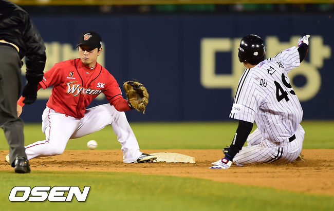 1일 오후 잠실구장서 열린 '2014 한국야쿠르트 세븐 프로야구' LG 트윈스와 SK 와이번스의 홈 개막전, 6회말 무사 주자 1루 LG 김용의 타석에서 1루 주자 문선재가 2루 도루를 시도, 포수 실책으로 볼이 빠지며 문선재는 3루에 세이프됐다.