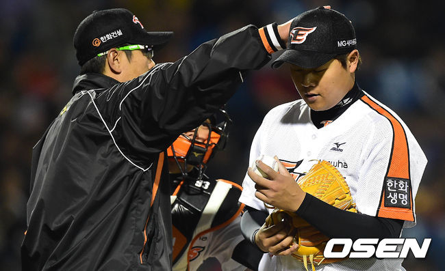 7회초 1사 1루에서 한화 유창식이 마운드를 내려가고 있다.