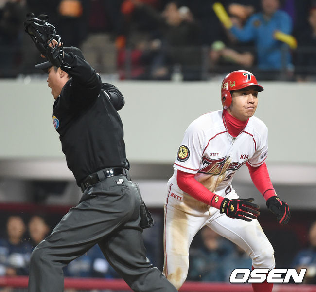 1일 오후 광주-기아챔피언스 필드 에서 열린 '2014 한국야쿠르트 세븐 프로야구' KIA 타이거즈와 NC 다이노스, KIA 타이거즈 홈개막 경기,8회말 1사 1,3루 이범호의 투수앞 땅볼때 3루 주자 이대형 선취 득점을 올리고 있다.