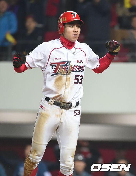 1일 오후 광주-기아챔피언스 필드 에서 열린 '2014 한국야쿠르트 세븐 프로야구' KIA 타이거즈와 NC 다이노스, KIA 타이거즈 홈개막 경기,8회말 1사 1,3루 이범호의 투수앞 땅볼때 3루 주자 이대형 선취 득점을 올리고 있다.