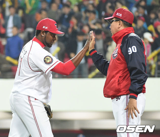 경기 종료후 KIA 타이거즈 소방수 어센시오가 선동렬 감독으로 부터 축하를 받고 있다./ ajyoung@osen.co.kr