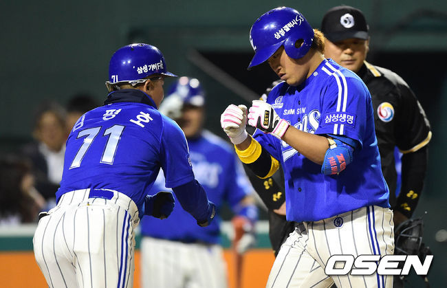 9회초 1사에서 삼성 박석민이 동점 솔로 홈런을 날리고 김평호 코치와 하이파이브를 하고 있다.