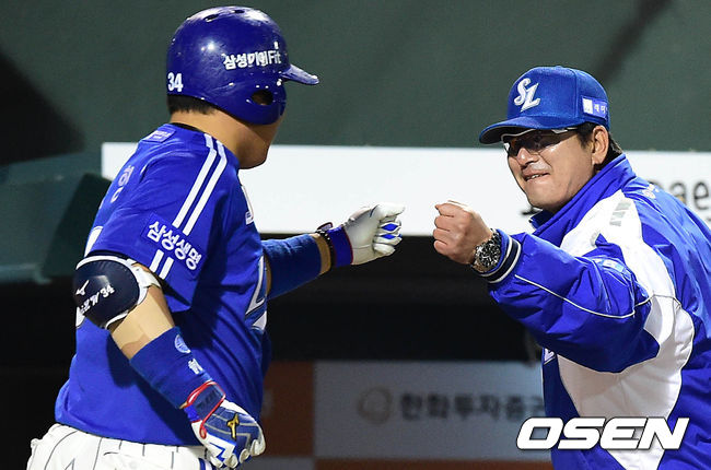 9회초 1사에서 삼성 최형우가 역전 솔로 홈런을 날리고 더그아웃에서 류중일 감독과 하이파이브를 하고 있다.