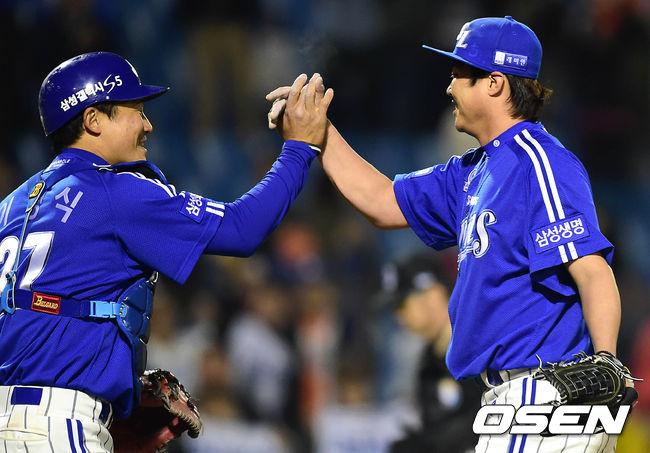경기 종료 후 삼성 이정식과 안지만이 승리의 기쁨을 나누고 있다./sunday@osen.co.kr