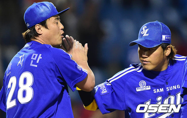 경기 종료 후 삼성 안지만과 박석민이 승리의 기쁨을 나누고 있다./sunday@osen.co.kr