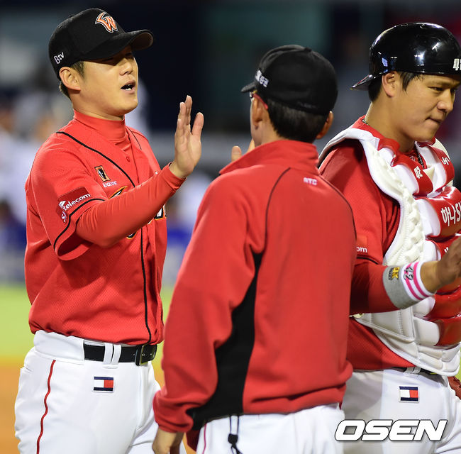 경기를 마치고 SK 박희수가 코치진들과 하이파이브를 하고 있다. / rumi@osen.co.kr