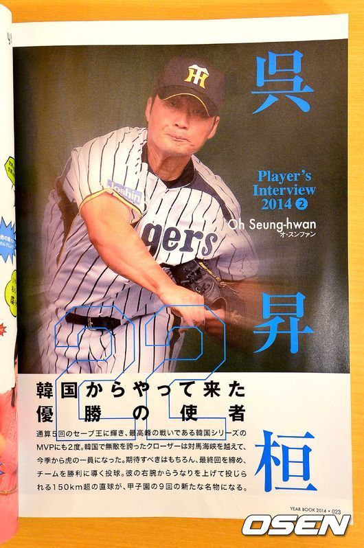 오승환은 인터뷰 첫머리에서 "한국에서도 온 우승 사자(使者)"로 소개됐다. 위 책은 "오승환은 한국에서 통산 5차례 세이브왕에 올랐고, 한국시리즈 MVP를 2회 수상했다. 한국에서는 무적의 마무리 투수였고 현해탄을 건너 올해부터 한신 일원이 됐다. 한신의 최종회를 마무리해주고 팀을 승리로 이끌어줄 투수다. 오른손으로부터 나오는 150km 이상의 직구가 고시엔의 새로운 명물이 될 것"이라고 전했다.