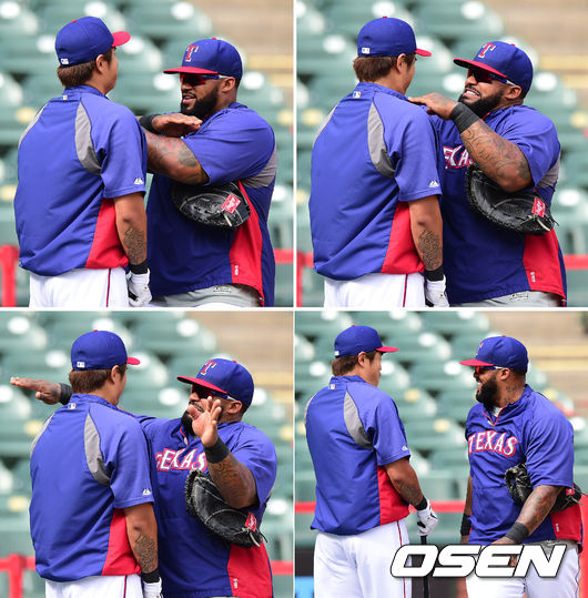 경기에 앞서 텍사스 추신수와 프린스 필더가 장난을 치고 있다.