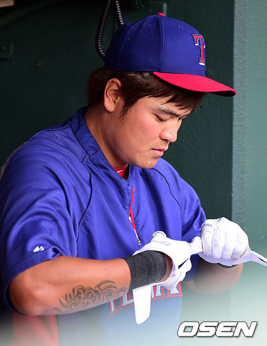 경기에 앞서 텍사스 추신수가 더그아웃에서 타격 훈련 준비를 하고 있다.