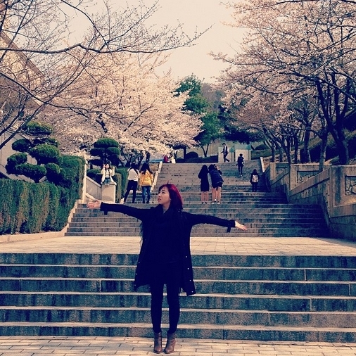 걸그룹 2NE1 멤버 공민지가 벚꽃이 가득 핀 캠퍼스에서 사진을 찍었다.