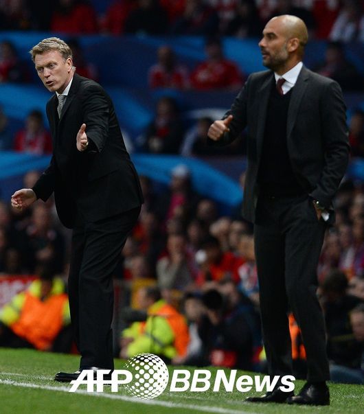 맨유 데이빗 모예스 감독(왼쪽)과 바이에른 뮌헨 호셉 과르디올라 감독이 경기 중 선수들을 독려하고 있다.