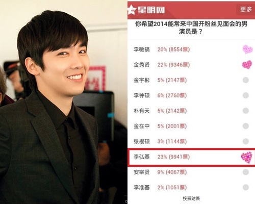‘2014년에 자주 중국에 와서 팬미팅을 했으면 하는 남자 배우는?’이라는 주제로 3월 24일부터 투표를 진행한 결과, 이홍기가 9941표로 23%의 득표율을 얻어 1위를 차지했다.