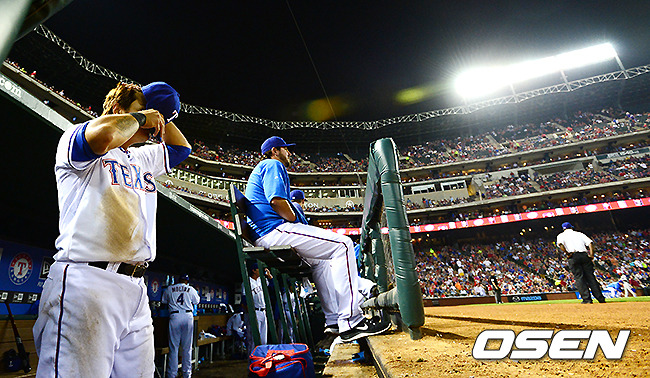6회말 공격을 마치고 텍사스 추신수가 더그아웃에서 수비 준비를 하고 있다.