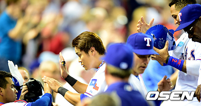 7회말 2사 3루에서 텍사스 추신수가 벨트레의 동점 적시2루타에 홈을 밟고 더그아웃에서 동료선수들과 기뻐하고 있다.