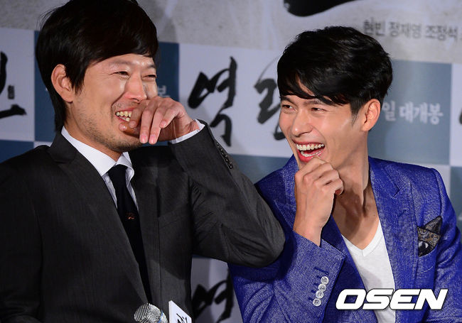 2일 오전 서울 광진구 롯데시네마 건대입구에서 열린 영화 '역린' 제작보고회에서 정재영과 현빈이 웃음을 터트리고 있다.