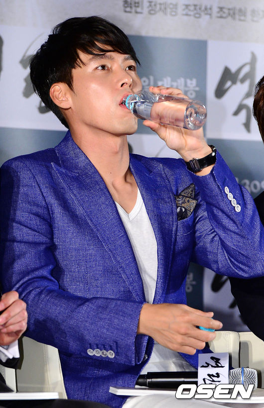 2일 오전 서울 광진구 롯데시네마 건대입구에서 열린 영화 '역린' 제작보고회에서 현빈이 음료를 마시고 있다.
