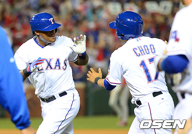 9회말 텍사스 벨트레의 끝내기 안타에 추신수가 홈을 밟고 벨트레와 승리를 기뻐하고 있다 ./ jpnews@osen.co.kr