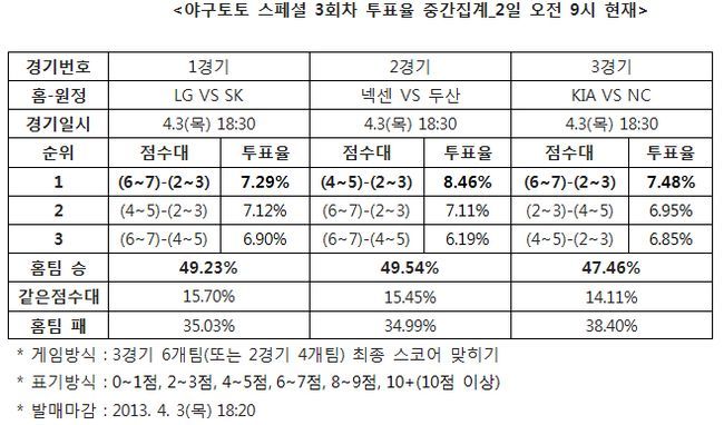 국민체육진흥공단(www.kspo.or.kr)이 발행하는 체육진흥투표권 수탁사업자인 스포츠토토의 공식 온라인 발매 사이트 베트맨(www.betman.co.kr)이 3일 열리는 한국프로야구(KBO) 3경기를 대상으로 한 야구토토 스페셜 3회차 투표율을 중간 집계한 결과, 참가자의 49.23%는 LG트윈스-SK와이번스(1경기)전에서 LG의 승리를 예상했다.