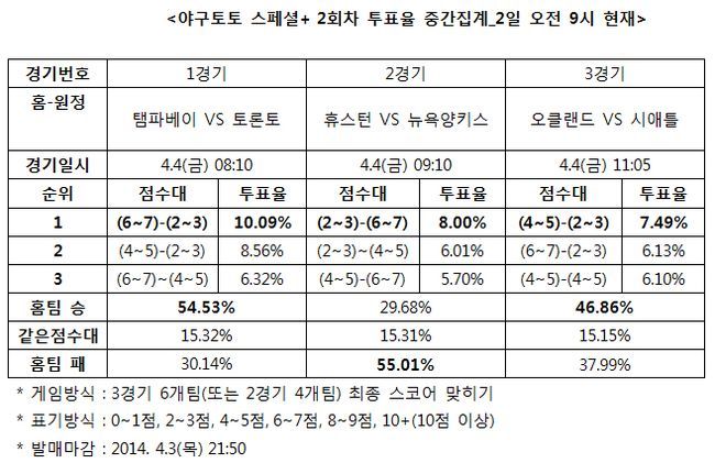 미국프로야구(MLB) 3경기 대상 야구토토 스페셜+ 2회차 투표율 중간집계