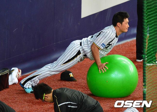 오승환이 2일 오후 일본 오사카 교세라돔에서 열리는 '2014 일본프로야구' 한신 타이거스 대 주니치 드래건스의 경기를 앞두고, 외야에서 푸시업으로 몸을 풀고 있다.