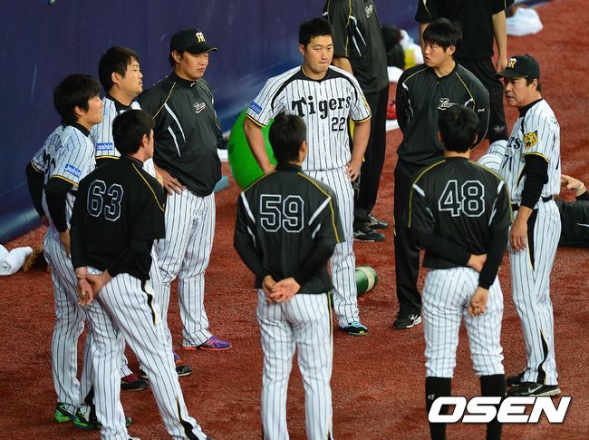 오승환이 2일 오후 일본 오사카 교세라돔에서 열리는 '2014 일본프로야구' 한신 타이거스 대 주니치 드래건스의 경기를 앞두고, 훈련을 앞두고 오승환을 비롯한 불펜투수들이 나카니시 투수코치와 대화를 나누고 있다.